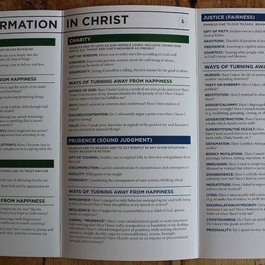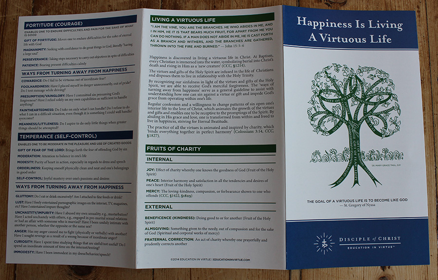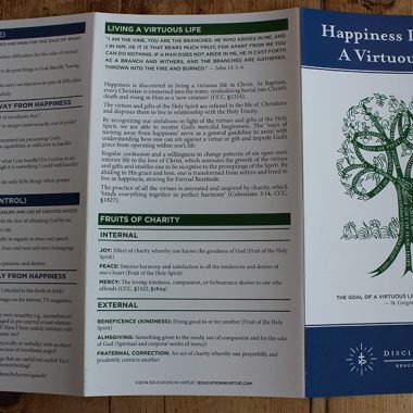 The Happiness is Living a Virtuous Life pamphlet is designed to help you, the instructor, and your older students on your own personal paths of Discipleship in Christ. Examine your conscience with the use of this virtue-based examen and identify the virtues you would like to cultivate. Complete with virtues and their opposing vices, concrete questions are given to help you on the path of conversion the first step to living a virtuous life. Share them with friends!